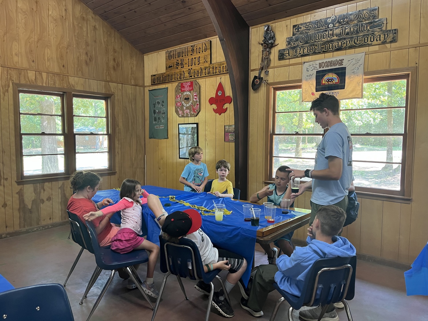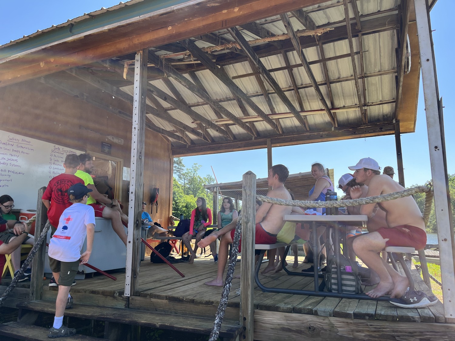Facilities include an air-conditioned Dining Hall, Conference Center, Administration Building, and Health Lodge; 4 air-conditioned Staff Cabins with restroom facilities; 8 campsites with shower houses and 8-person cabins; 2 primitive campsites; 2 large pavilions; a COPE Course; a Waterfront with swimming docks and boating; and a Shooting Sports area.